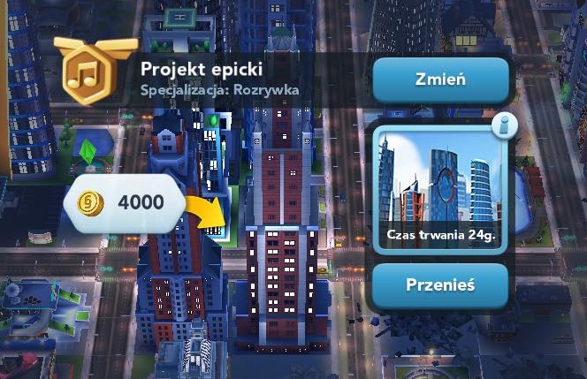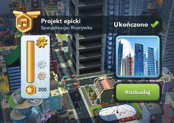 Po rozpoczęciu projektu w budynku epickim widzimy jaki jest poziom projektu, a w budynkach specjalizacji (np.” stadion, kasyno, kolejka górska) dostaniemy zadanie do zrobienia oraz informację ile punktów za to zadanie otrzymamy. Oczywiście tylko budynki specjalizacji w której robimy projekt dają zadania jeżeli robimy projekt epicki w specjalizacji rozrywka, to budynki innych specjalizacji nie będą dawały nam zadań.
