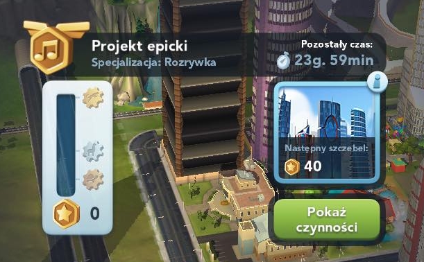 Po rozpoczęciu projektu w budynku epickim widzimy jaki jest poziom projektu, a w budynkach specjalizacji (np.” stadion, kasyno, kolejka górska) dostaniemy zadanie do zrobienia oraz informację ile punktów za to zadanie otrzymamy. Oczywiście tylko budynki specjalizacji w której robimy projekt dają zadania jeżeli robimy projekt epicki w specjalizacji rozrywka, to budynki innych specjalizacji nie będą dawały nam zadań.