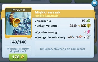 Poniżej w tabeli znajduje się zestawienie dotyczące ilości kart i złotych kluczy potrzebnych do ulepszania katastrofy, a także otrzymane punkty na każdym poziomie.